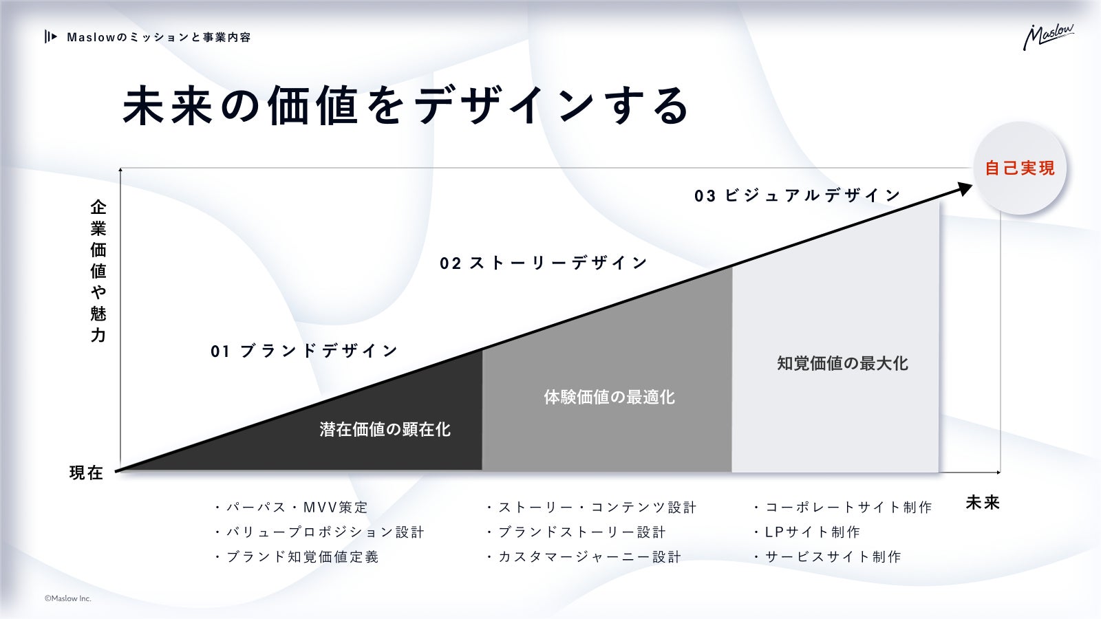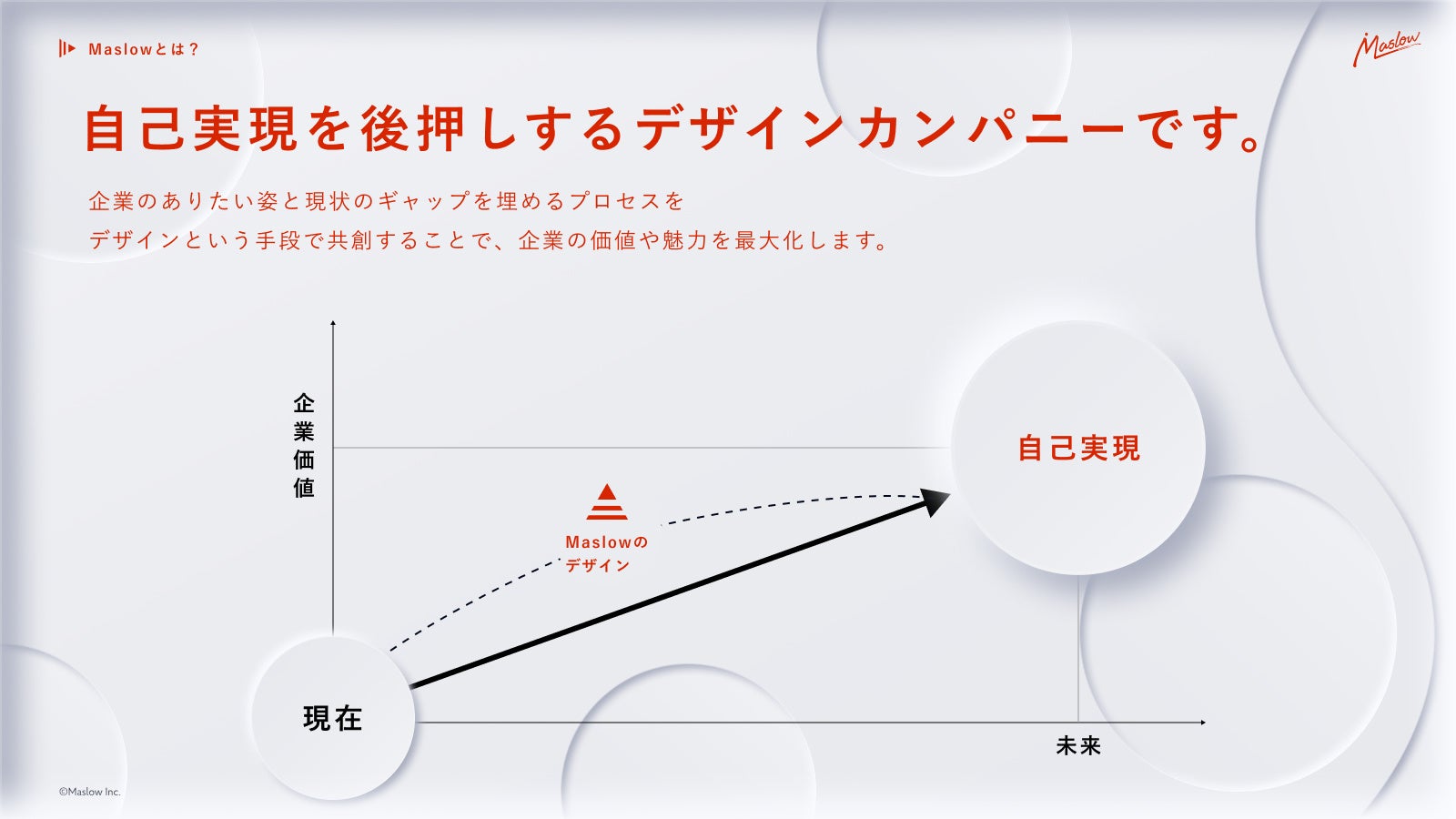 Maslow®︎は、自己実現を後押しするデザインカンパニーです。企業のありたい姿と現状のギャップを埋めるプロセスをデザインという手段で共創することで、企業の価値や魅力を最大化します。