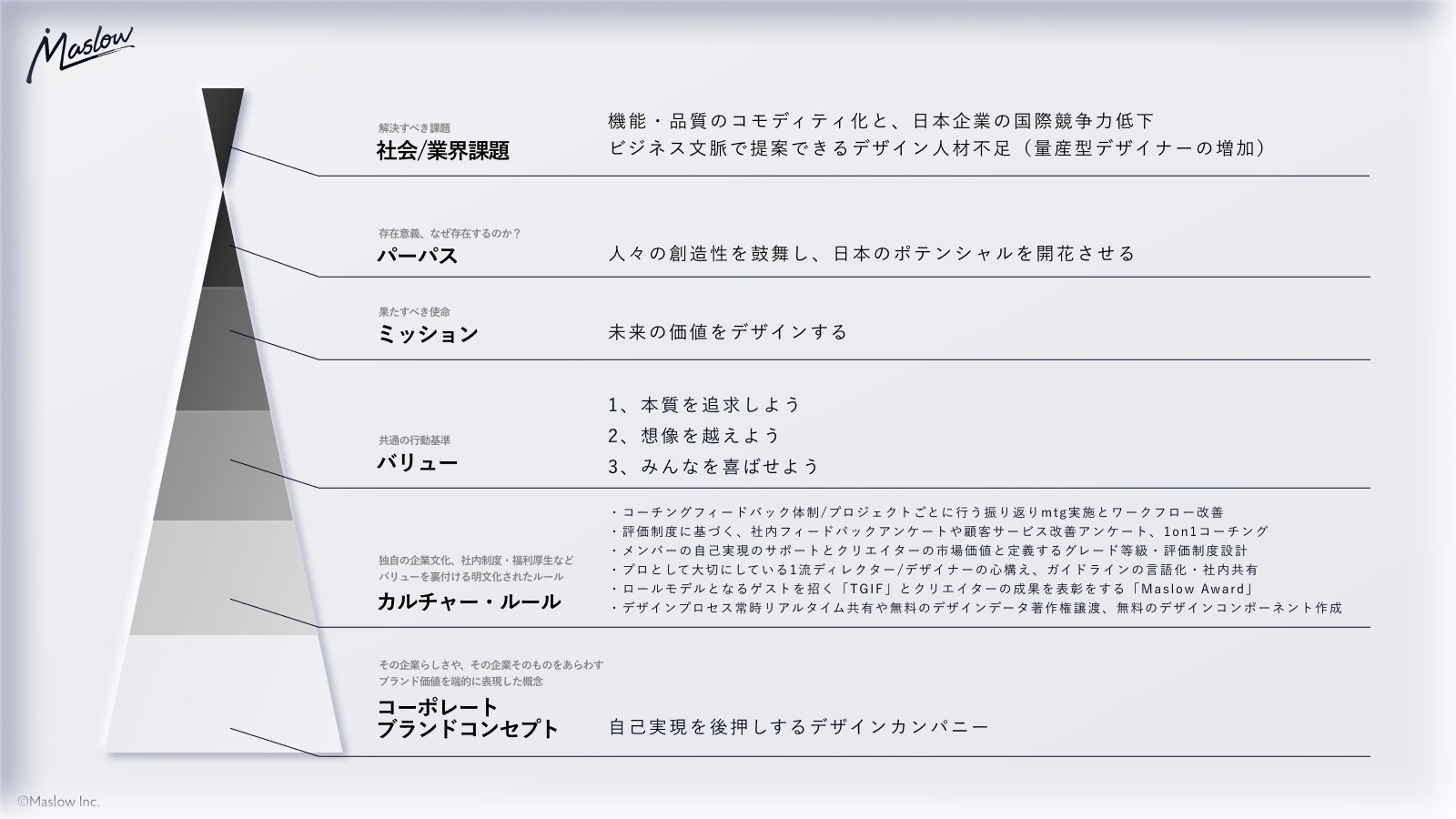 自己実現を後押しするデザインカンパニー、Maslow株式会社(本社:東京都渋谷区、代表取締役社長:安達卓則、以下当社)は、新たにパーパスを制定しました。クリエイティブデザインだけでなく、パーパスデザイン、ブランドデザインなど、企業活動のより本質的な部分から価値向上をサポートしていきます。